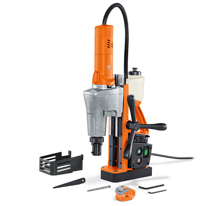 重量轻冲程大的两挡经济型磁力钻带有 MK3 工具固定夹座,具备基本功能,适用于在车间和施工现场进行空心钻孔和麻花钻孔。